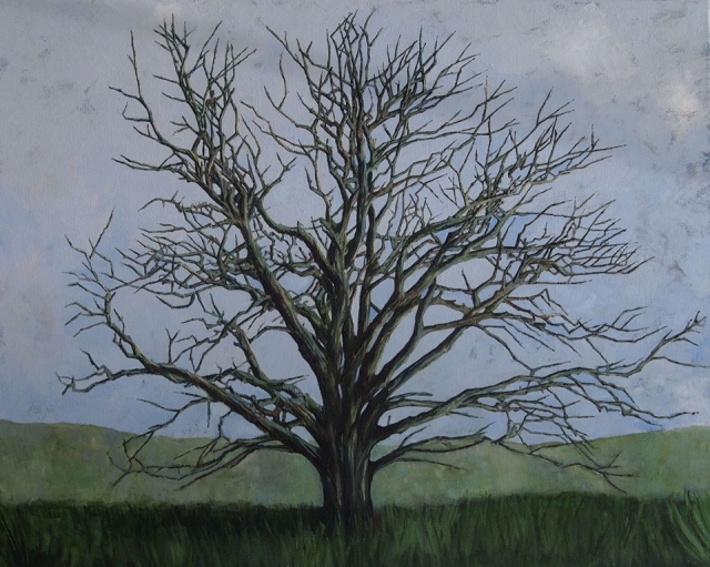 I’ve always most of all enjoyed painting landscapes, and especially trees; I love the changing patterns made against the sky by the branches and leaves, and am always moved by the sight of an ancient dead tree in a green and vibrant setting. I also enjoy painting the small rather whimsical pictures that very often include one of my dogs, either past or present.